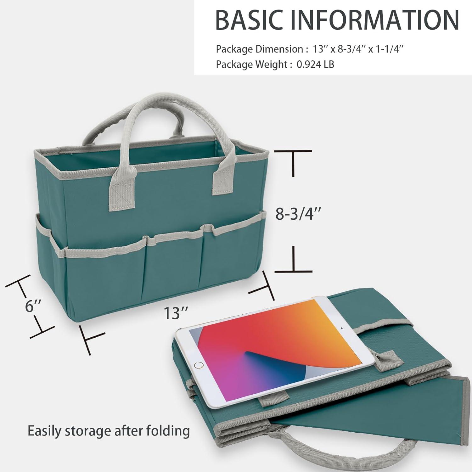 Sufficient Size: Our tool tote has a center compartment that holds about 2.5 gallons of items and outside pockets for your little pencils, pens, scissors, eraser, and more
