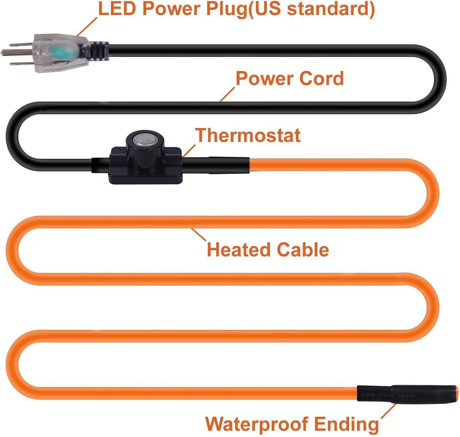 Easy Installation: All you need to do is lay our heating tape straight or wrap it around the water pipe and secure it with the supplied fiberglass tape; and if you want to test it, please put the thermostat in ice water, plug it in, wait for a few minutes you can feel the cable heating up