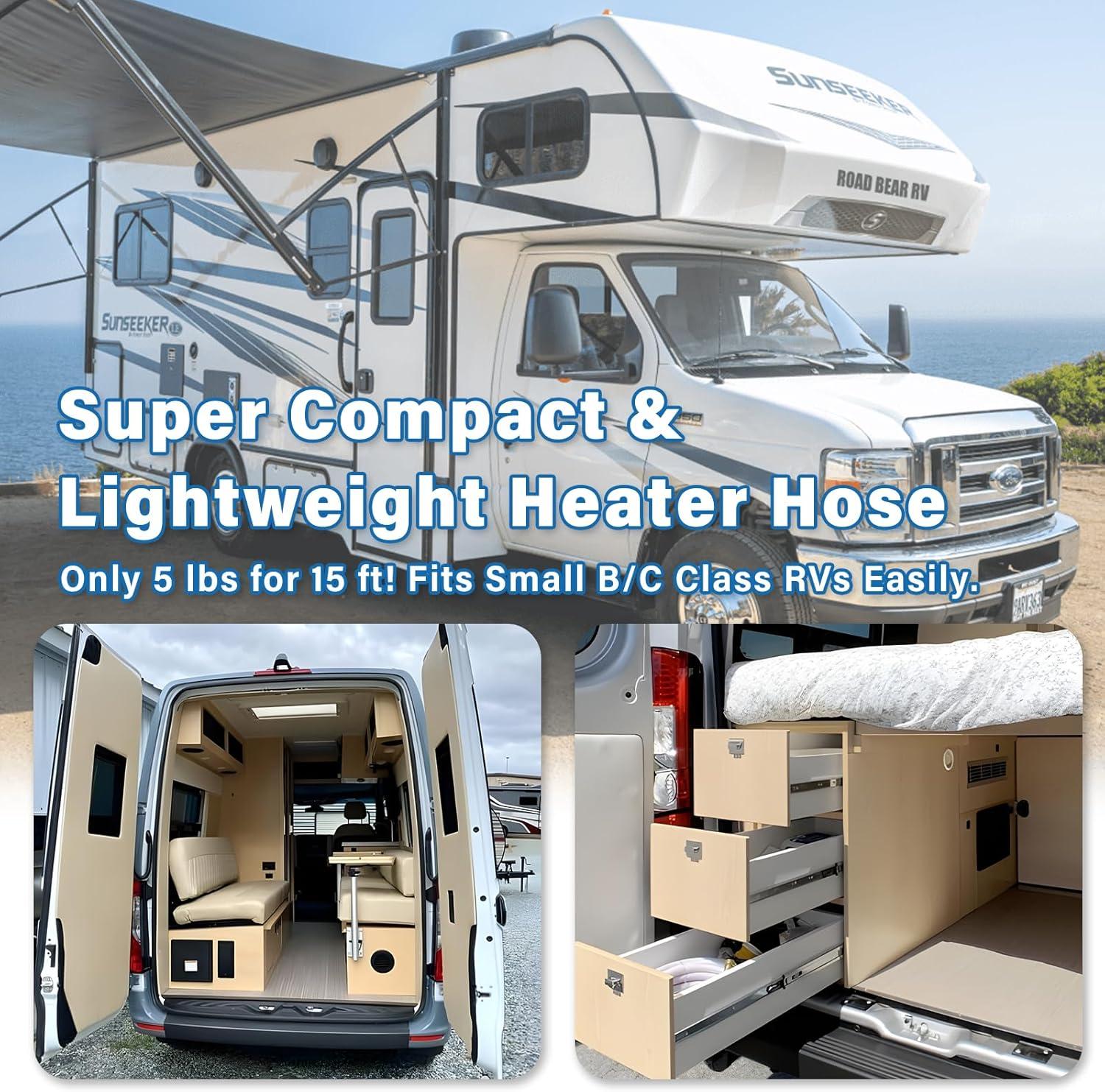 Lightweight, Compact & Easy to Handle: Weighing only 5 lbs per 15FT section, this hose is exceptionally easy to maneuver and store. Its highly flexible design coils tightly, making it an excellent fit for Class B/C RVs and four-season adventures