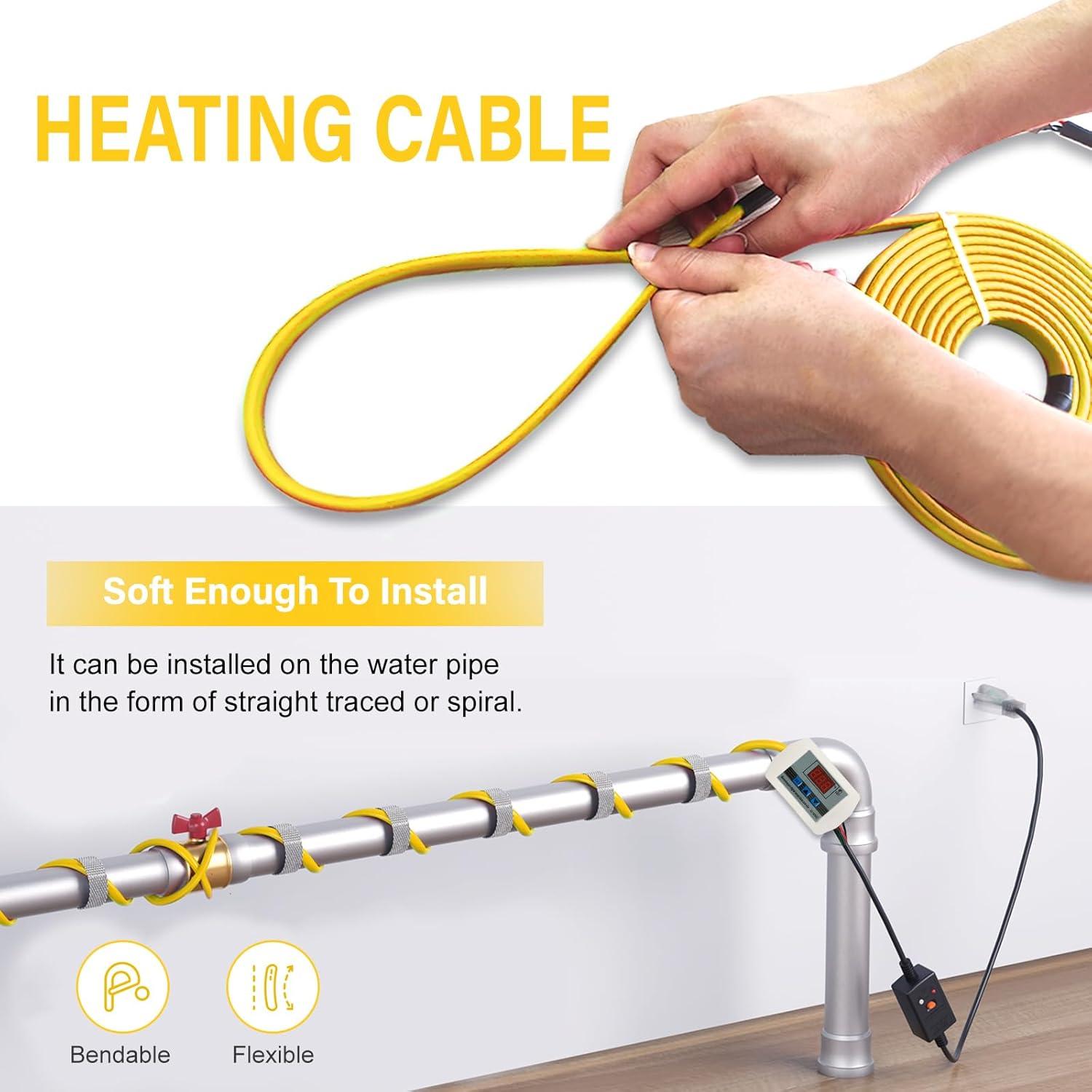 Easy Installation: All you need to do is lay our heating tape straight or wrap it around the water pipe and secure it with the supplied fiberglass tape; and if you want to test it, please put the thermostat in ice water, plug it in, wait for a few minutes you can feel the cable heating up