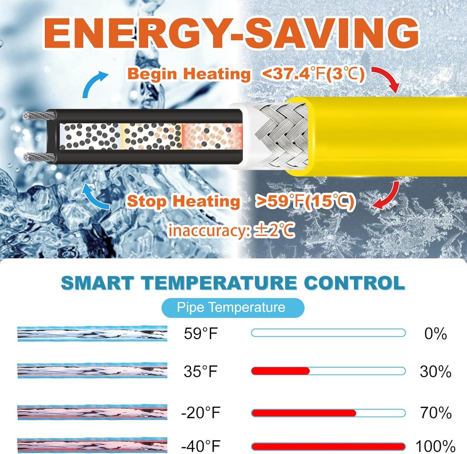 Plumbing Protection: Our pipe heating cable uses electricity to heat the entire length of the hose in order to keep the hose above the 59℉ (15°C) so that at -40°F (-40°C) in winter night, the water will flow smoothly through your hose as well, due to ordinary water hose may freeze water due to low temperature